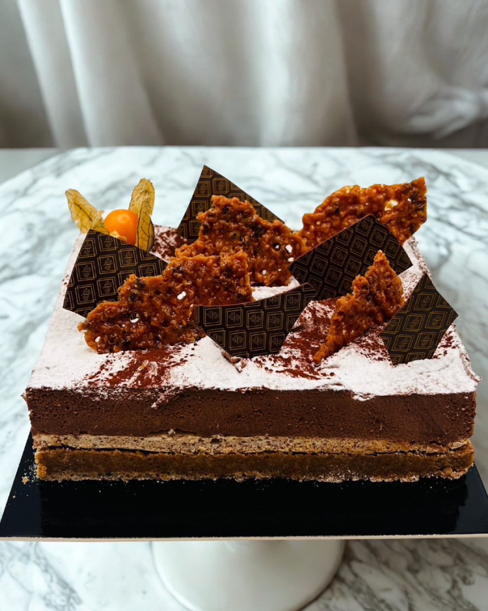 Biscuit amande, praliné feuilletée, mousse légère chocolat noir.