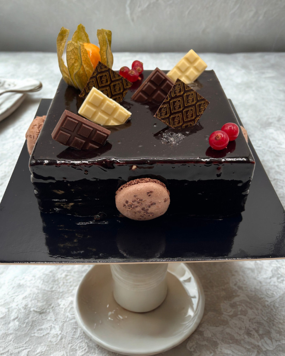 Biscuit chocolat, superposition de mousse chocolat noir, lait, blanc.
