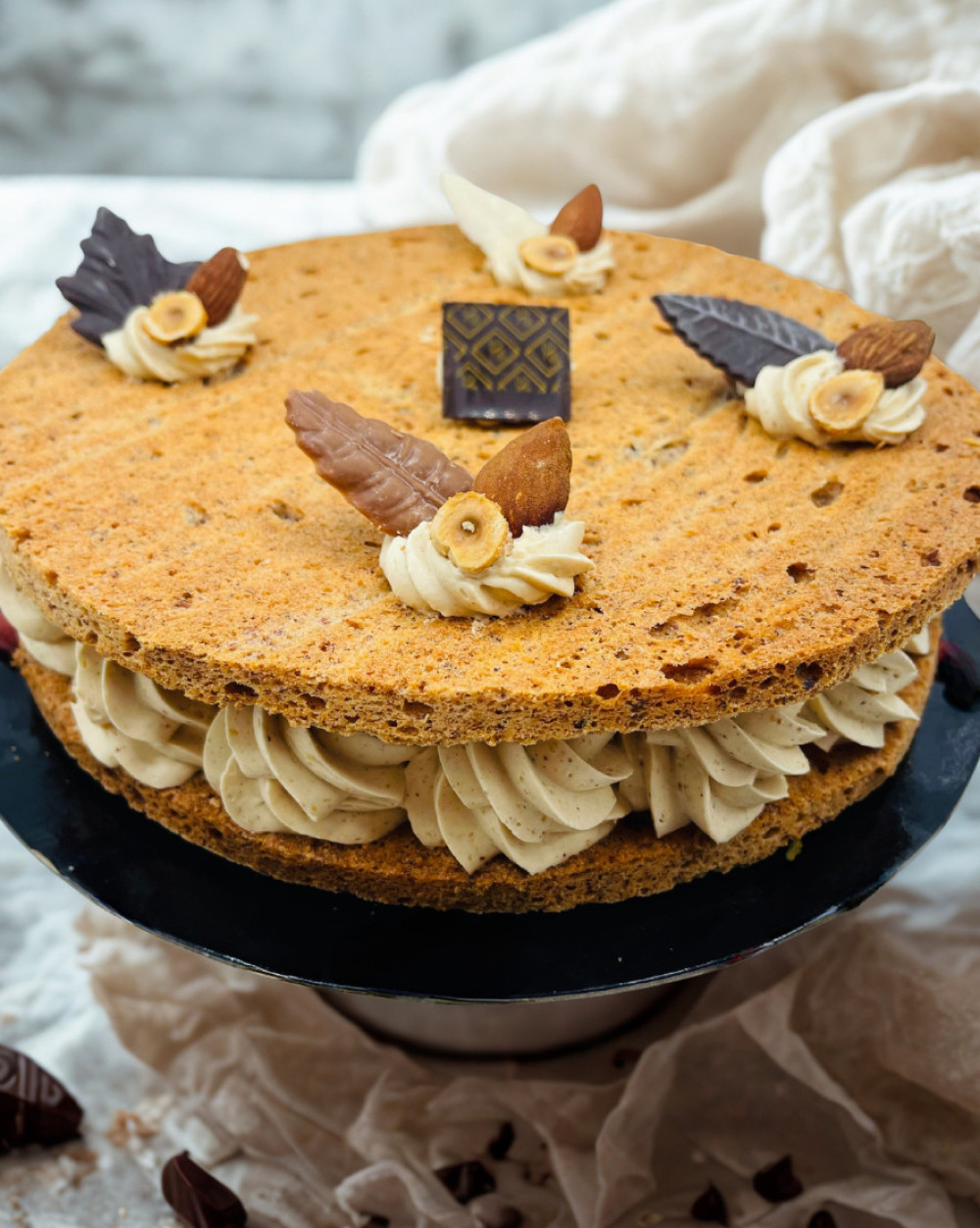 Fond meringué noisettes, crème praliné, éclats de nougatine.