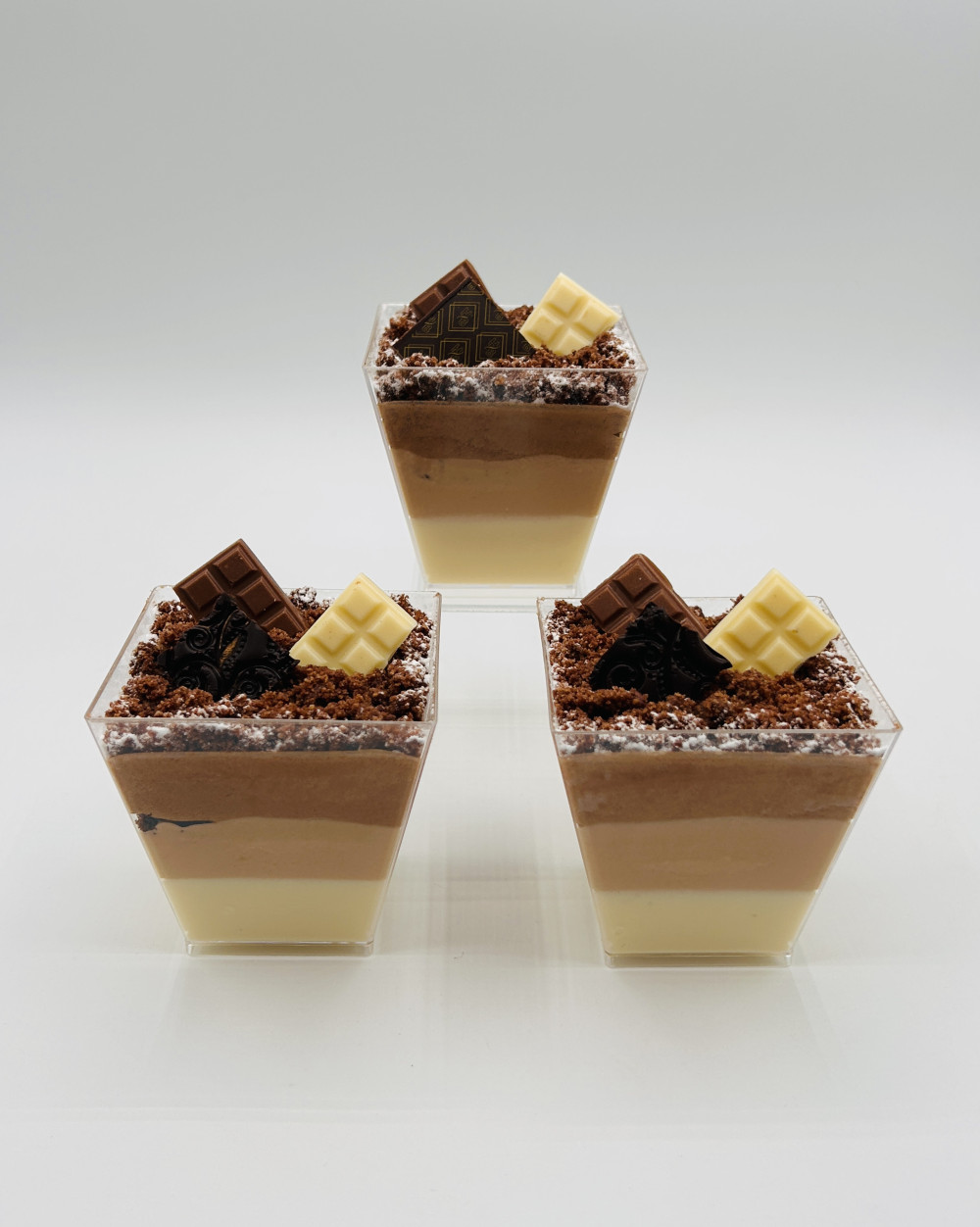 Biscuit chocolat, superposition de mousse chocolat noir, lait, blanc.