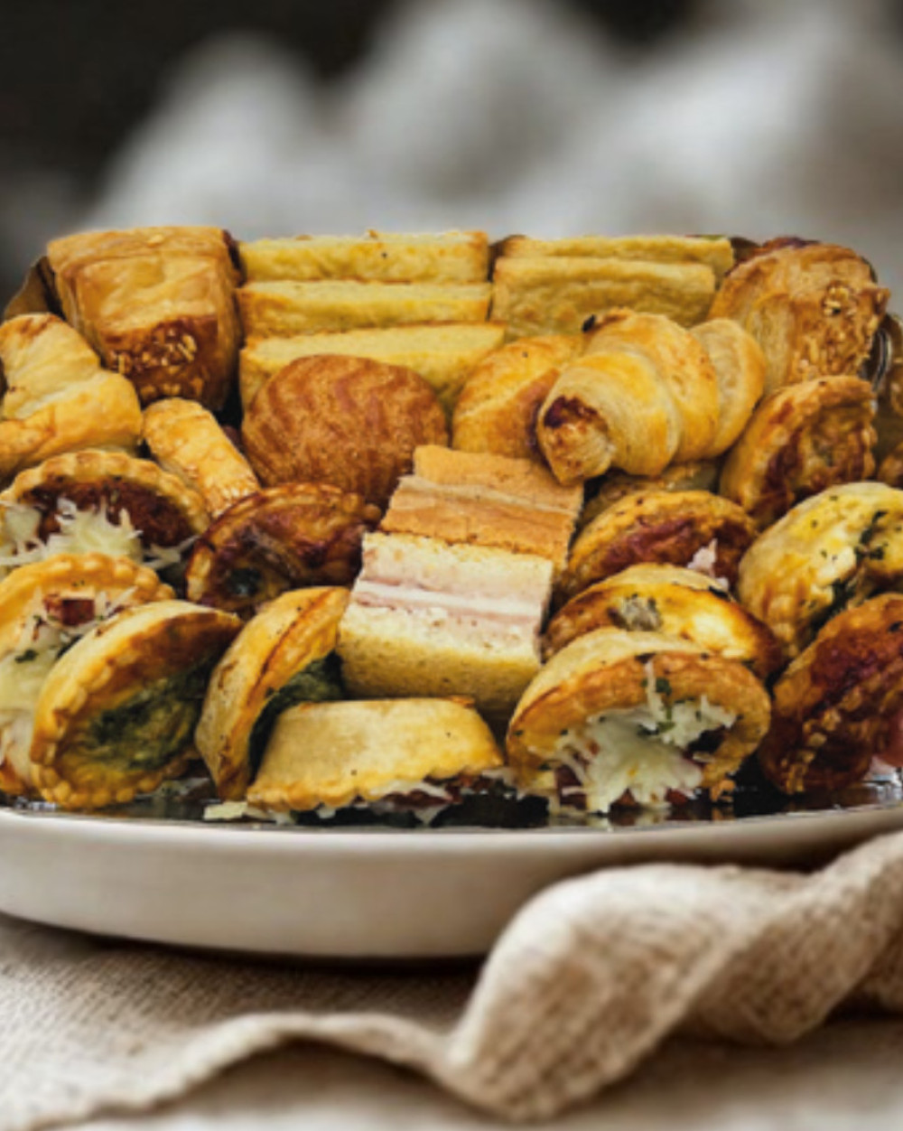 Assortiments de mini quiche lorraine, saumon-épinard, provençale . Mini cake curry pavot, feuilletée saucisse, croissant au jambon, croq‛ monsieur, gougère fromage, et la fameuse galette de pomme de terre.