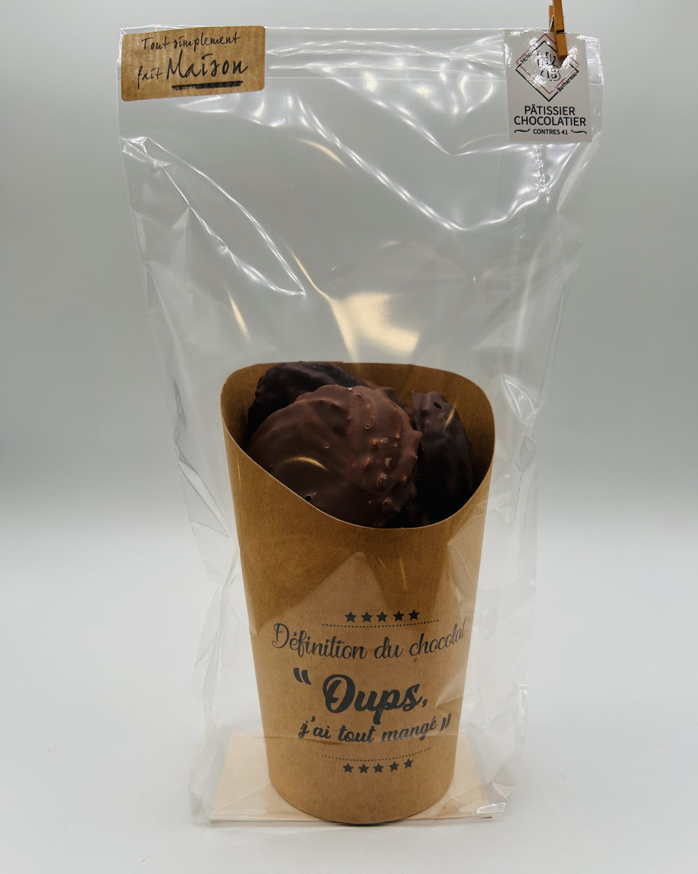 Orangettes . Lamelles d'écorces d'oranges confites enrobées 58% ( écorce d'orange, sucre,sirop de glucose, dextrose ), féves de cacao, sucre, beurre de cacao, beurre concentré (lait) , émulsifiant, ( lécithine de tournesol ) extrait naturel de vanille.