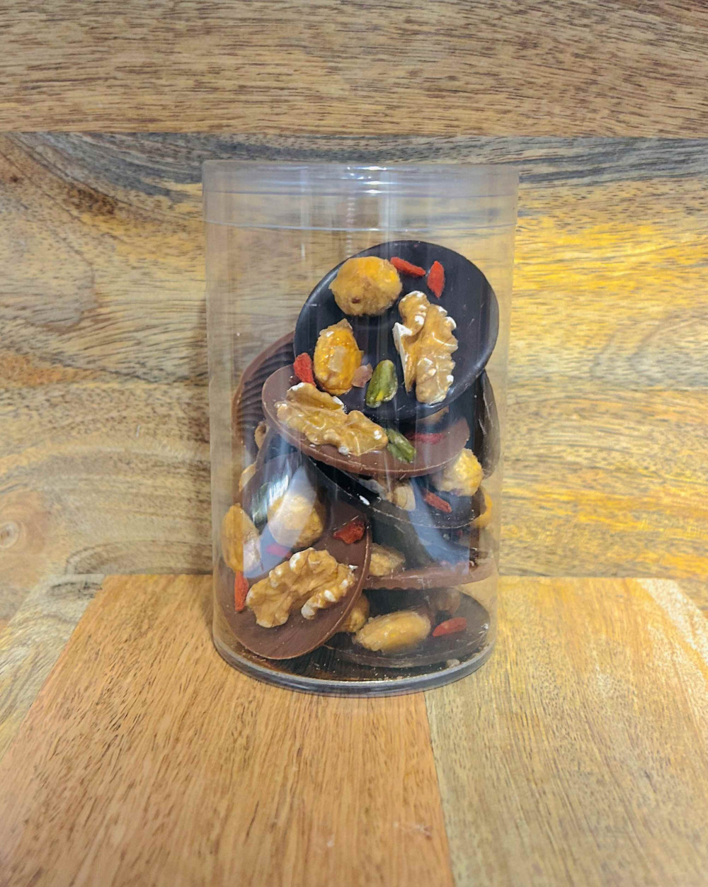 Mendiant Noir et lait : Chocolat de couverture noire 70% minimum de cacao : (pâte de cacao,sucre, beurre de cacao, lécithine de soja, vanille). Chocolat de couverture lait 35% de cacao minimun : (pur beurre de cacao sucre, beurre de cacao, lait, entier en poudre, fèves de cacao, émulsifiant, lécithine de tournesole, extrait naturelle de vanille). fruits secs : amande,pistache, noisettes, noix, noix de pécan, baie de goji Traces possible d’œufs, de gluten, de graine de sésame, de lait et de fruits à coque.  Pâtisserie H.B 2 rue de la fonderie 41700 Contres