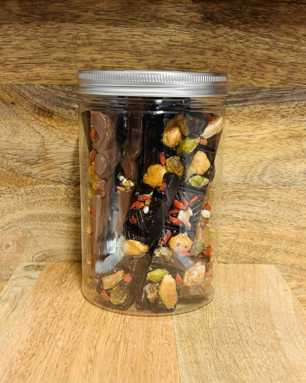 Mendiant Noir et lait : Chocolat de couverture noire 70% minimum de cacao : (pâte de cacao,sucre, beurre de cacao, lécithine de soja, vanille). Chocolat de couverture lait 35% de cacao minimun : (pur beurre de cacao sucre, beurre de cacao, lait, entier en poudre, fèves de cacao, émulsifiant, lécithine de tournesole, extrait naturelle de vanille). fruits secs : amande,pistache, noisettes, noix, noix de pécan, baie de goji Traces possible d’œufs, de gluten, de graine de sésame, de lait et de fruits à coque. Pâtisserie H.B 2 rue de la fonderie 41700 Contres