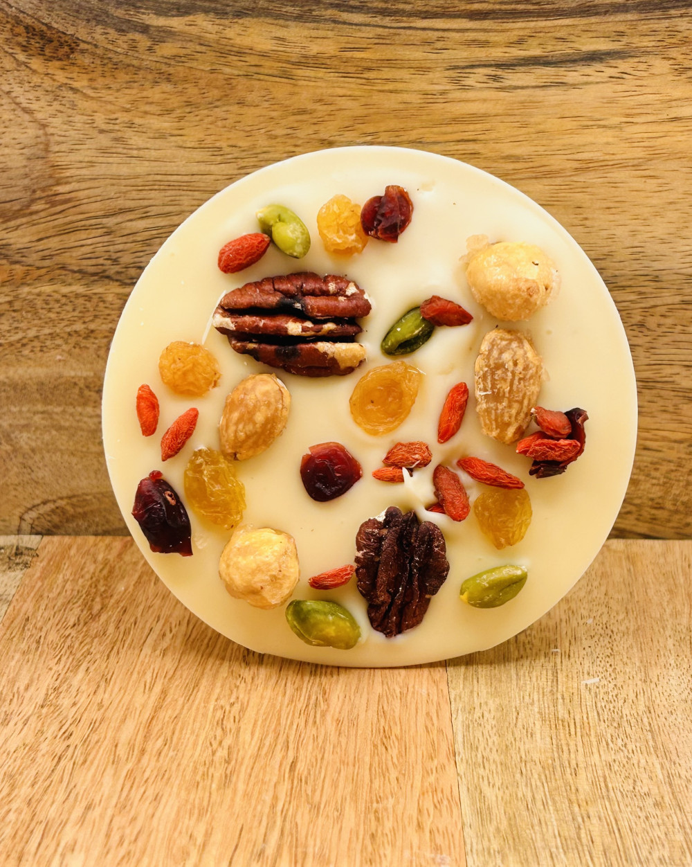 Mendiant Blanc : Chocolat de couverture blanc 30% minimum de cacao sucre, beurre de cacao, poudre de lait entier, émulsifiant (lécithine de SOJA (E322)), arôme naturel de vanille). fruits secs : amande,pistache, noisettes, noix, noix de pécan, baie de goji Traces possible d’œufs, de gluten, de graine de sésame, de lait et de fruits à coque. DDM : Pâtisserie H.B 2 rue de la fonderie 41700 Contres